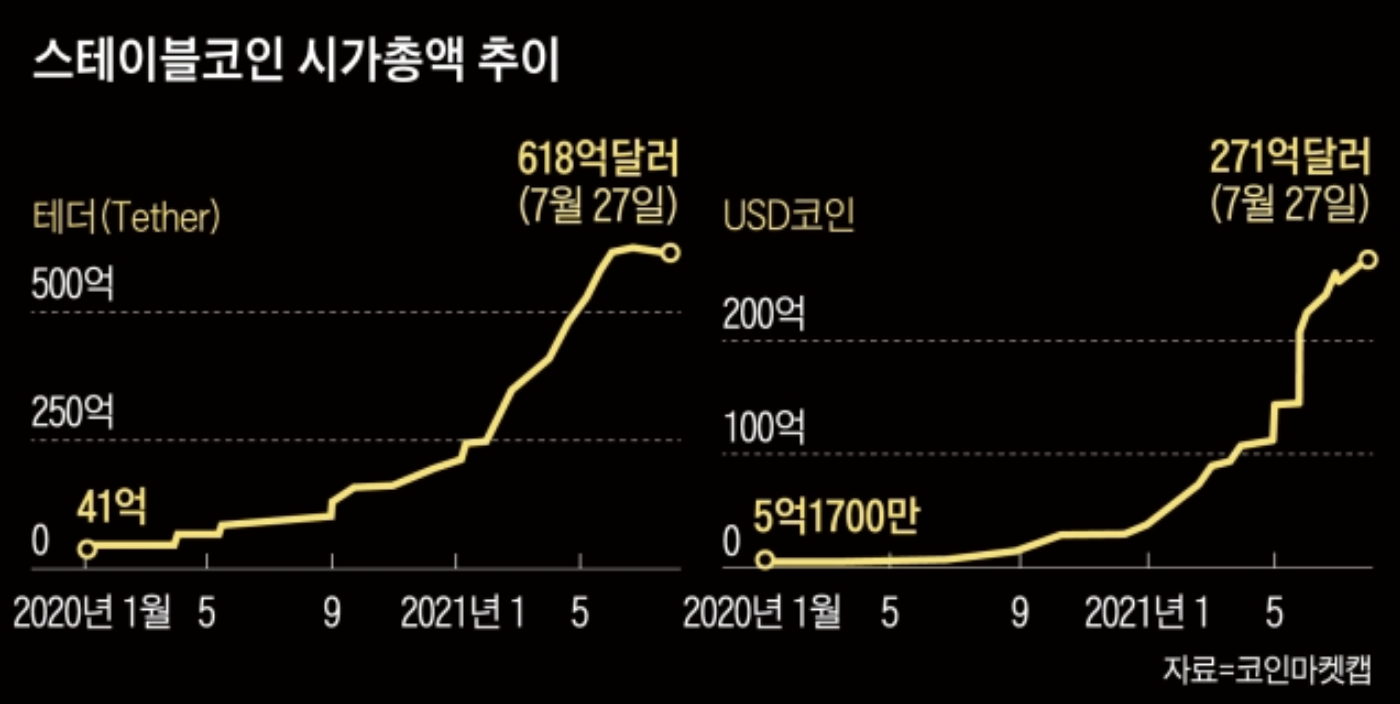 스테이블코인은 지난해 가상 화폐 시장의 폭발적 성장과 함께 그 위상이 크게 높아졌다. 원화로 가상 화폐를 거래하는 국내와 달리, 해외에선 스테이블코인을 거쳐서 비트코인 등 다른 가상 화폐를 사고파는 경우가 많았기 때문이다. 스테이블코인은 또 디파이(DeFi·탈중앙화 금융) 같은 가상 화폐 기반 금융 상품에서도 널리 사용되고 있다. 스테이블코인을 예치해 이자를 받거나, 스테이블코인을 담보로 다른 가상 화폐를 대출받을 수 있다. 다른 가상 화폐를 담보로 스테이블코인을 대출받기도 한다. 이처럼 쓰임새가 많다보니 2017년 7월 27일 기준 테더(618억달러)와 USD코인(271억달러), 바이낸스USD(120억달러) 등 3대 스테이블코인의 시가총액만 1009억달러(약 116조1964억원)에 달한다. 1년 전(110억달러)보다 10배 가까이 늘었다.