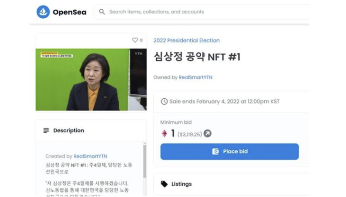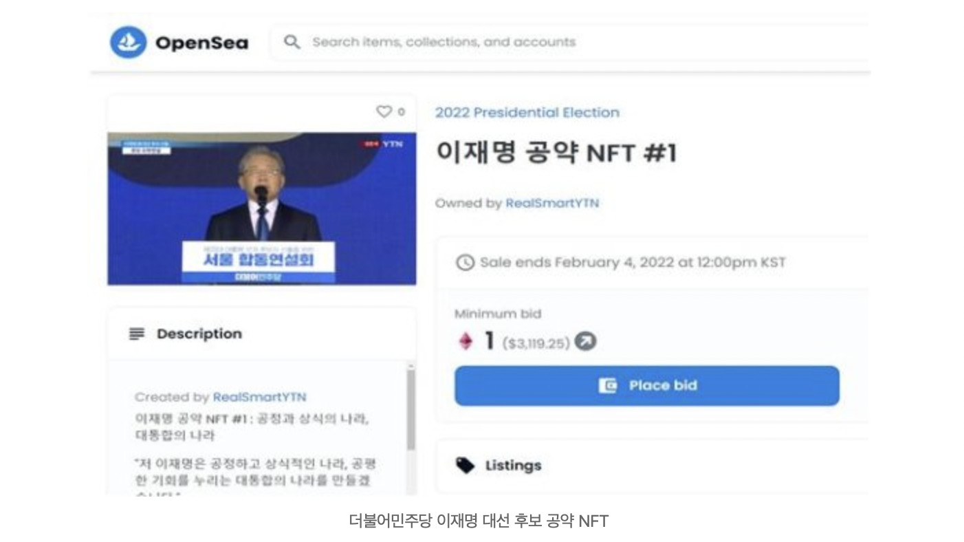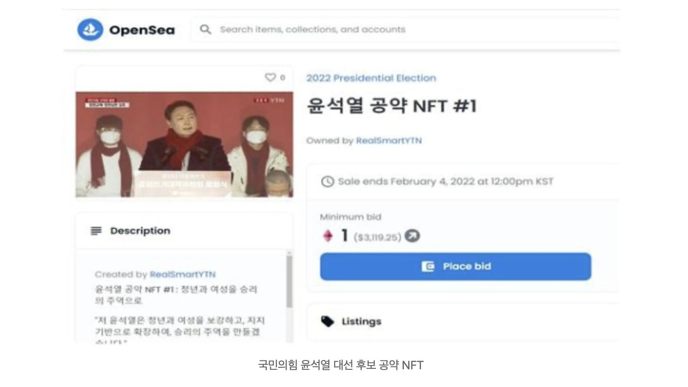 2022년 1월 21일 YTN은 이재명 더불어민주당 대선후보와 윤석열 국민의힘 대선 후보, 심상정 정의당 후보와 안철수 민의당 대선 후보 4명의 후보 수락 연설, 핵심 공약 보도 영상을 대체불가능토큰(NFT)으로 발행했다고 밝혔다. 영상 내용은 각 후보자 측이 직접 선택했다.
