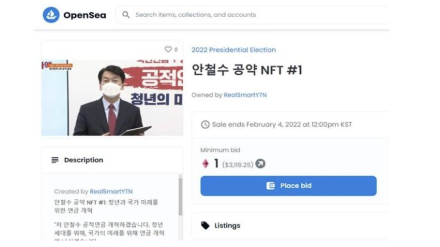 NFT는 내달 4일 정오까지 글로벌 NFT 플랫폼인 오픈씨에서 경매 방식으로 소장자에게 인계될 예정이다. 대선 공약의 NFT는 위변조가 불가능한 블록체인 상에 국민에 대한 약속을 영구히 각인한다는 의미를 지닌다. NFT에 담긴 후보들의 공약과 대국민 약속은 블록체인 네트워크가 존재하는 한 수정하거나 바꿀 수 없다.